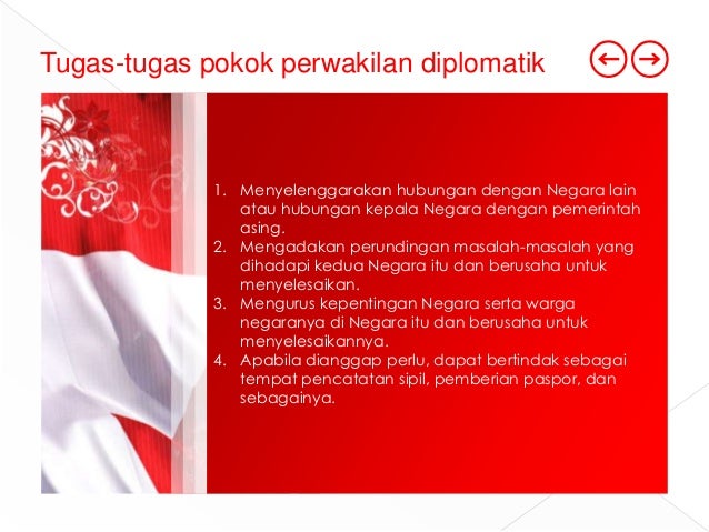- 2. Tugas-tugas pokok perwakilan diplomatik 1. Menyelenggarakan hubungan dengan Negara lain atau hubungan kepala Negara dengan pemerintah asing. 2. Mengadakan perundingan masalah-masalah yang dihadapi kedua Negara itu dan berusaha untuk menyelesaikan. 3. Mengurus kepentingan Negara serta warga negaranya di Negara itu dan berusaha untuk menyelesaikannya. 4. Apabila dianggap perlu, dapat bertindak sebagai tempat pencatatan sipil, pemberian paspor, dan sebagainya.