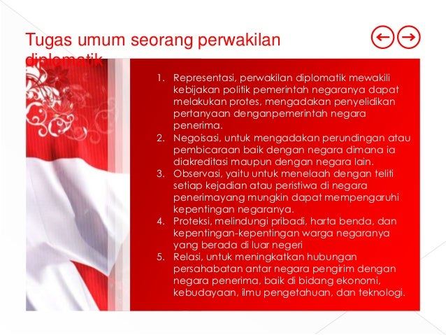 - 3. Tugas umum seorang perwakilan diplomatik 1. Representasi, perwakilan diplomatik mewakili kebijakan politik pemerintah negaranya dapat melakukan protes, mengadakan penyelidikan pertanyaan denganpemerintah negara penerima. 2. Negoisasi, untuk mengadakan perundingan atau pembicaraan baik dengan negara dimana ia diakreditasi maupun dengan negara lain. 3. Observasi, yaitu untuk menelaah dengan teliti setiap kejadian atau peristiwa di negara penerimayang mungkin dapat mempengaruhi kepentingan negaranya. 4. Proteksi, melindungi pribadi, harta benda, dan kepentingan-kepentingan warga negaranya yang berada di luar negeri 5. Relasi, untuk meningkatkan hubungan persahabatan antar negara pengirim dengan negara penerima, baik di bidang ekonomi, kebudayaan, ilmu pengetahuan, dan teknologi.