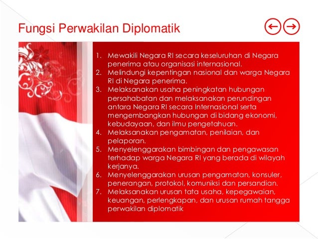 - 4. Fungsi Perwakilan Diplomatik 1. Mewakili Negara RI secara keseluruhan di Negara penerima atau organisasi internasional. 2. Melindungi kepentingan nasional dan warga Negara RI di Negara penerima. 3. Melaksanakan usaha peningkatan hubungan persahabatan dan melaksanakan perundingan antara Negara RI secara Internasional serta mengembangkan hubungan di bidang ekonomi, kebudayaan, dan ilmu pengetahuan. 4. Melaksanakan pengamatan, penilaian, dan pelaporan. 5. Menyelenggarakan bimbingan dan pengawasan terhadap warga Negara RI yang berada di wilayah kerjanya. 6. Menyelenggarakan urusan pengamatan, konsuler, penerangan, protokol, komuniksi dan persandian. 7. Melaksanakan urusan tata usaha, kepegawaian, keuangan, perlengkapan, dan urusan rumah tangga perwakilan diplomatik