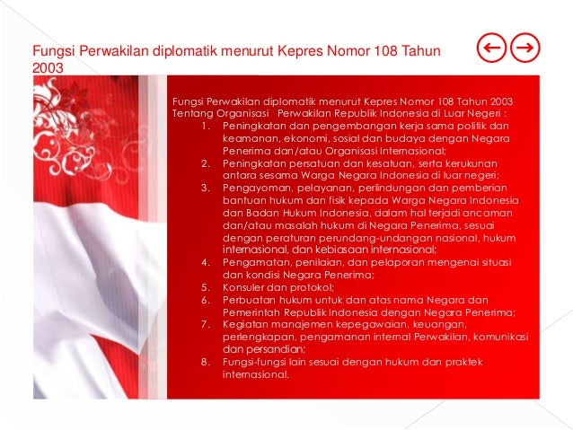 - 5. Fungsi Perwakilan diplomatik menurut Kepres Nomor 108 Tahun 2003 Fungsi Perwakilan diplomatik menurut Kepres Nomor 108 Tahun 2003 Tentang Organisasi Perwakilan Republik Indonesia di Luar Negeri : 1. Peningkatan dan pengembangan kerja sama politik dan keamanan, ekonomi, sosial dan budaya dengan Negara Penerima dan/atau Organisasi Internasional; 2. Peningkatan persatuan dan kesatuan, serta kerukunan antara sesama Warga Negara Indonesia di luar negeri; 3. Pengayoman, pelayanan, perlindungan dan pemberian bantuan hukum dan fisik kepada Warga Negara Indonesia dan Badan Hukum Indonesia, dalam hal terjadi ancaman dan/atau masalah hukum di Negara Penerima, sesuai dengan peraturan perundang-undangan nasional, hukum internasional, dan kebiasaan internasional; 4. Pengamatan, penilaian, dan pelaporan mengenai situasi dan kondisi Negara Penerima; 5. Konsuler dan protokol; 6. Perbuatan hukum untuk dan atas nama Negara dan Pemerintah Republik Indonesia dengan Negara Penerima; 7. Kegiatan manajemen kepegawaian, keuangan, perlengkapan, pengamanan internal Perwakilan, komunikasi dan persandian; 8. Fungsi-fungsi lain sesuai dengan hukum dan praktek internasional.