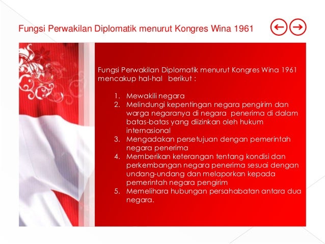 - 6. Fungsi Perwakilan Diplomatik menurut Kongres Wina 1961 Fungsi Perwakilan Diplomatik menurut Kongres Wina 1961 mencakup hal-hal berikut : 1. Mewakili negara 2. Melindungi kepentingan negara pengirim dan warga negaranya di negara penerima di dalam batas-batas yang diizinkan oleh hukum internasional 3. Mengadakan persetujuan dengan pemerintah negara penerima 4. Memberikan keterangan tentang kondisi dan perkembangan negara penerima sesuai dengan undang-undang dan melaporkan kepada pemerintah negara pengirim 5. Memelihara hubungan persahabatan antara dua negara.
