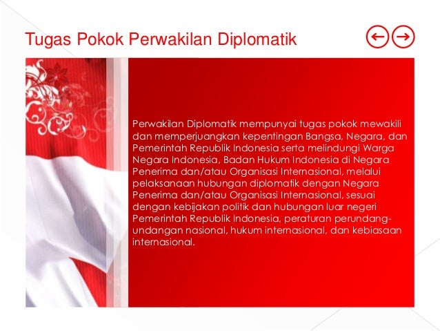 - 8. Tugas Pokok Perwakilan Diplomatik Perwakilan Diplomatik mempunyai tugas pokok mewakili dan memperjuangkan kepentingan Bangsa, Negara, dan Pemerintah Republik Indonesia serta melindungi Warga Negara Indonesia, Badan Hukum Indonesia di Negara Penerima dan/atau Organisasi Internasional, melalui pelaksanaan hubungan diplomatik dengan Negara Penerima dan/atau Organisasi Internasional, sesuai dengan kebijakan politik dan hubungan luar negeri Pemerintah Republik Indonesia, peraturan perundangundangan nasional, hukum internasional, dan kebiasaan internasional.